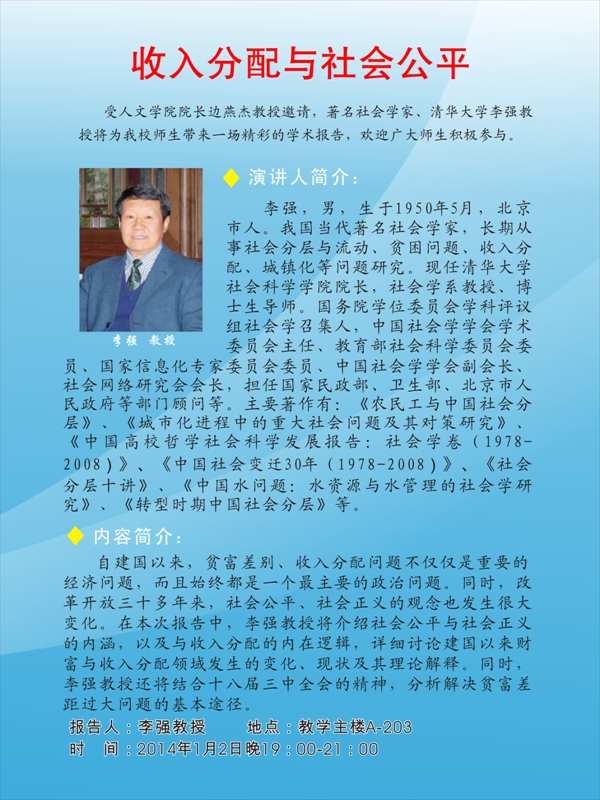 演讲人简介:李强,男,出生于1950年5月,北京人。我国著名社会学家,长期从事社会分层与流动、贫困问题、收入分配、城镇化等问题研究。现任清华大学社会科学学院院长,社会学系教授、博士生导师。国务院学位委员会学科评议组成员,中国社会学学会学术委员会主任、教育部社会科学委员会委员、国家信息化专家委员会委员、中国社会学学会副会长、社会网络研究会会长(专家组组长),担任国家民政部、卫生部、北京市人民政府等部门顾问等。主要著作有:《农民工与中国社会分层》、《城市化进程中的重大社会问题及其对策研究》、《中国高校哲学社会科学发展报告:社会学卷(1978-2008)》、《中国社会变迁30年(1978-2008)》、《社会分层十讲》、《中国水问题:水资源与水管理的社会学研究》、《转型时期中国社会分层》等。