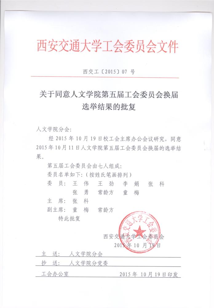 经2015年10月19日校工会主席办公会议研究,同意2015年10月11日91视频第五届工会委员会换届的选举结果。 现将审批选举结果的文件公布如下,详见附件。