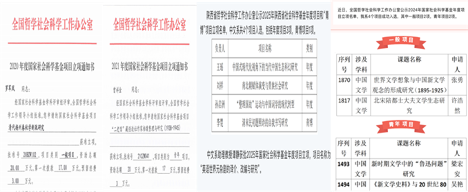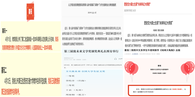 中文系连续三年本科毕业论文(孙晨晨、许墨芃菲、淳若阳)被评为校级优秀毕业论文,2名研究生获得校级优秀毕业论文(戴思宇、陈天丰)。指导学生获得第八届中国国际互联网+大学生创新创业大赛省级银奖,西安交通大学金奖、银奖等多个奖项,1名学生获得“未来科幻大师奖”。本科生李昀齐在第三届“致未来文学奖”中获得“大学生长安主题征文”一等奖。牛煜琛(指导教师王瑶)的“国家科普科幻IP‘地球大龟裂’孵化项目”入选陕西省第七届研究生创新成果展高质量成果。