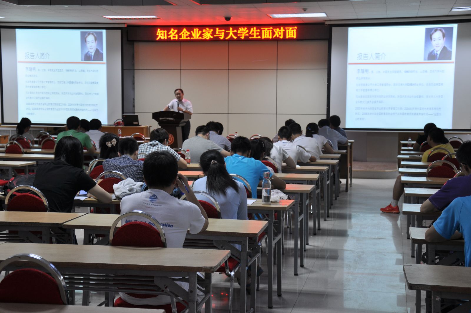 接下来,两位企业家分别做了精彩的讲演。李瑞明院长首先从中华民族辉煌灿烂的历史角度指出我们的民族是富有智慧和创造力的,并且鼓舞当代大学生要承担起历史赋予我们的责任与使命,多读书,丰富自己的头脑,增长自己的才干,成为社会和国家需要的人才。之后,就创业需要具备的条件、就业需要注意的事项等问题进行了精辟分析,并强调创业需要天时地利人和,就业需要知识、资金、经验和人脉等因素的配合。