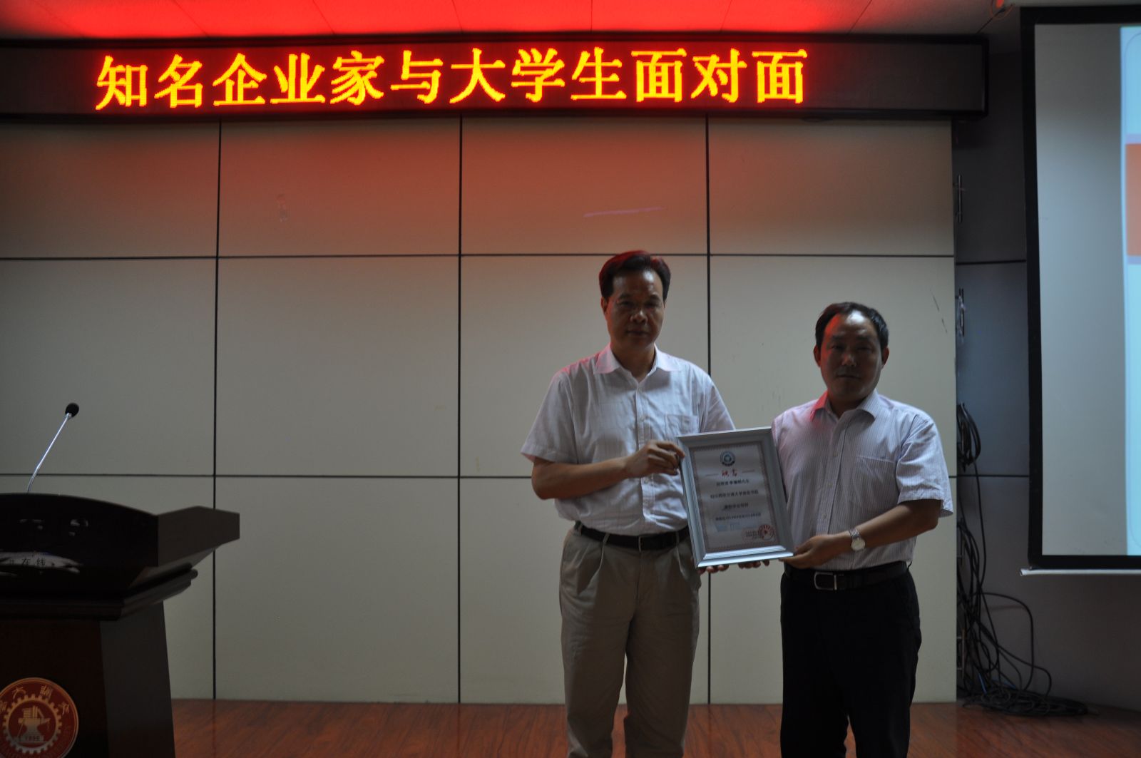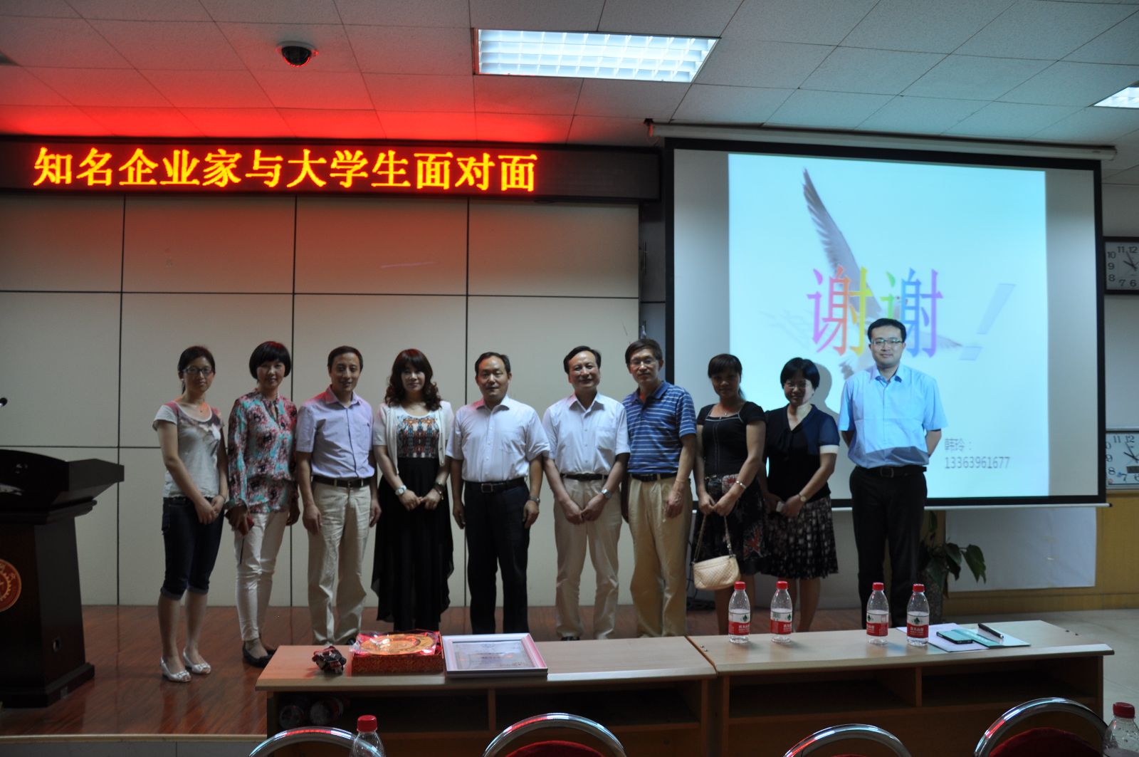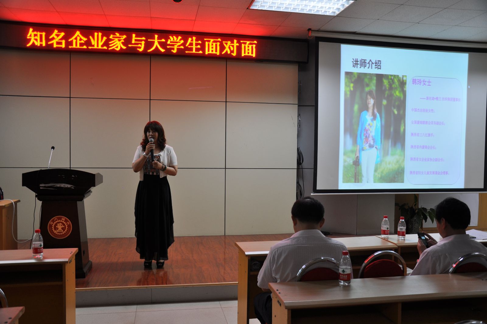 韩玲女士则更多地和同学们分享了自己的创业经历。为了童年的梦想和换一种生活方式的想法,她毅然决然地放弃了公安干警这份稳定的工作,投身到打工的浪潮中。长达八年的打工生涯,让她成功地由一个打工妹蜕变为一位知性、优雅、成熟、坚强的企业家。面对一次又一次的挫折与坎坷,她没有屈服,而是恪守信念,执着追逐,努力成为一位能创造财富,也能承担社会责任的企业家。她的经历,让现场所有的大学生为之感动和振奋,演讲中多次响起热烈的掌声。
