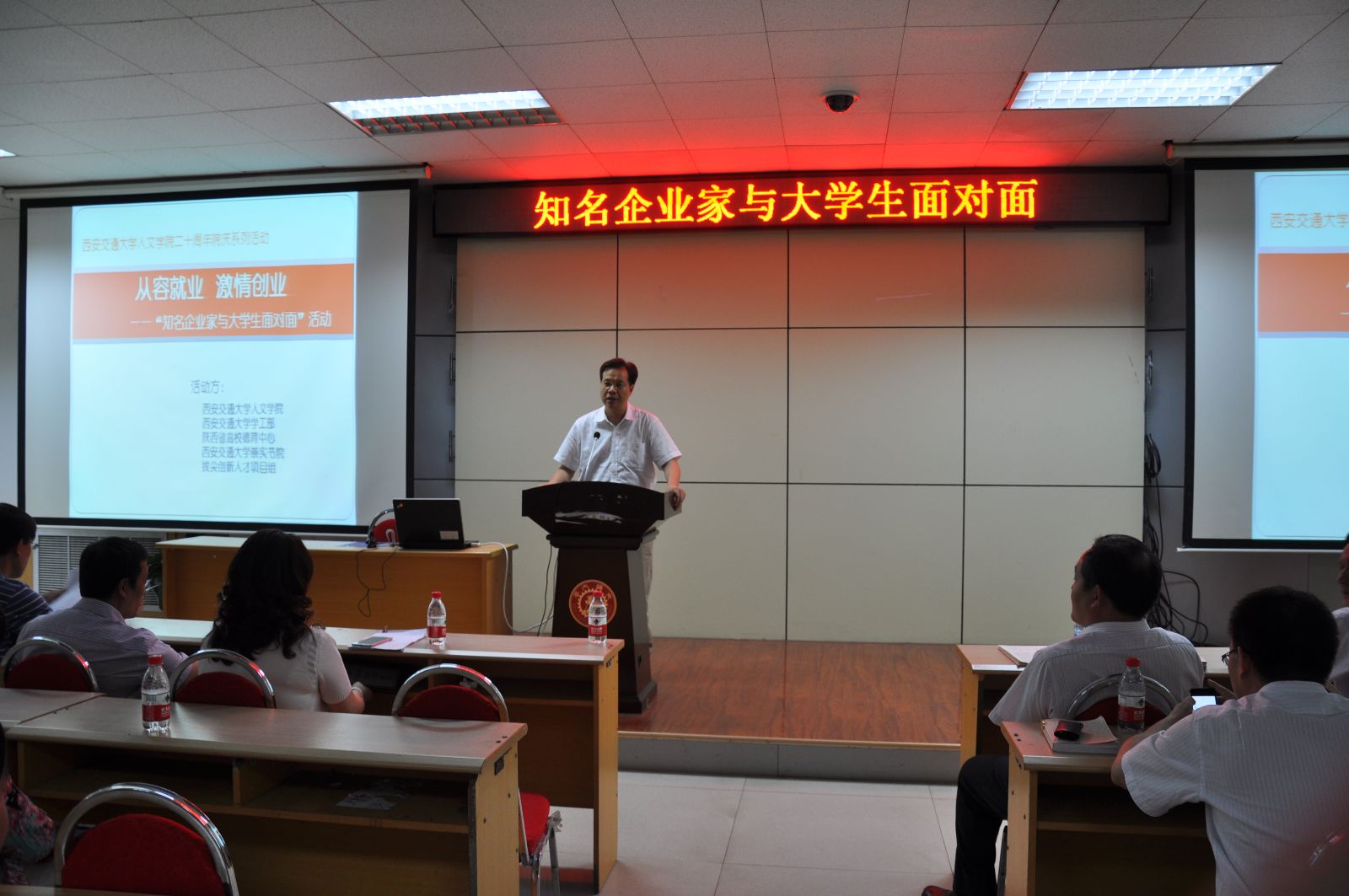 这次活动邀请了西安汽车科技职业学院院长李瑞明和雅兰纺织集团董事长韩玲两位优秀企业家与学生进行面对面交流,讲述创业故事,分享创业经验。西安交通大学副校长兼崇实书院院长卢天健教授,学生处副处长叶明老师、李重老师,崇实书院院务副主任许春秀老师,91视频马晓彬书记、宋永平副书记,91视频思政所卢黎歌教授、杨华副教授等人出席了本次活动。