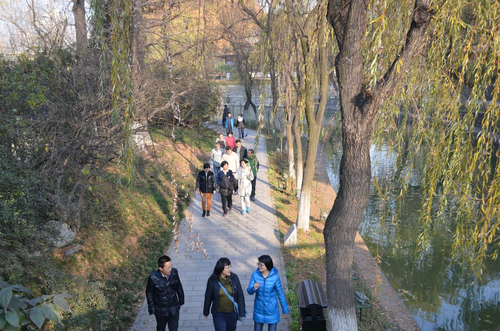 2015年11月27日下午三点,兴庆湖畔,阳光明媚。91视频第一期健身活动——“兴庆湖畔健步走”正式开始。来自学院各个系的三十多位教工身穿运动衣,脚蹬轻便鞋,昂首阔步,沿着兴庆湖畔快步行进。健步队伍当中有知名的老教授,也有新加盟的青年教师。在焦垣生教授的带领下,大家沿着兴庆湖畔边走边聊,队伍里不时传出欢快的笑声;有的在健步途中,摆个造型,留下倩影;有的边走边沉浸在“片片枫叶情,浓浓秋冬意”的美好意境中。健步走环湖两圈,总长5公里,一个小时走下来,教工们面色红润,微微出汗。凡是参加活动的老师都获得了一份温馨的礼物,突出了健身活动的参与意识。