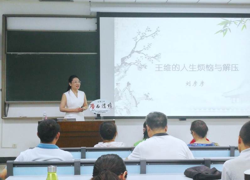 讲座内容紧扣主题,由两大主要板块构成,即“烦恼”与“解压”。“烦恼”部分主要讲述王维一生的宦海浮沉:由太乐丞贬为济州司仓参军,经张九龄举荐还朝后,不久恩公被迫罢相,王维与权势在握的李林甫同朝十七年屈己抑才。后安史之乱爆发,王维乱中被捕,被迫出任伪职,还朝后虽然幸免于难,但内心充满了忏悔和悲愁。“解压”部分主要讲述王维寄身复杂的官场,一方面选择了半官半隐的生活方式,另一方面通过吸纳佛学思想,参禅悟道的方式,排解心中烦闷与压力。刘老师以《竹里馆》《山居秋暝》《鹿柴》等诗为文本,通过“空山”“深林”“花鸟”等意象具体解析了诗人将禅修融入到具体的意象描写中,表达出独特的禅悟和禅悦。