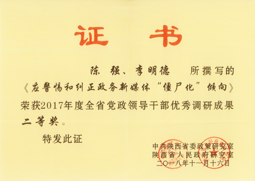 该报告对全省政务新媒体的发展状况进行了系统调研与评估。《报告》认为,我省政务新媒体处于“僵尸”状态的现象比较严重,在一定程度上影响了“陕西新形象”的构建与传播,因此有必要及时做好有关纠查工作,形成合力抓好监督管理,将政务新媒体纳入政府网站考评体系,建立和健全政务新媒体的问责机制,运用相关技术智能监测政务新媒体。《报告》在陕西省决策咨询委员会主办的《决策咨询建议》刊发后,得到了省政府领导同志的批示肯定,并产生实质性的政策影响。陕西省人民政府办公厅发出《关于转发省决咨委<应警惕和纠正政务新媒体“僵尸化”倾向>调研报告(摘要)的通知》的文件,要求“各市结合文中反映出来的问题,对政府系统政务新媒体进行一次全面检查,杜绝僵尸化问题”。此前,该《报告》曾荣获陕西省决策咨询委员会颁发的2017年度优秀决策咨询建议三等奖。
