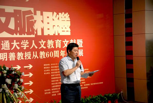 西安交通大学党委书记张迈曾首先发表致辞,他从个人与钟明善教授交往的朴素小事谈起以表敬意,表示琐细点滴恰恰展现了一个知识分子的家国情怀与赤子之心,总结钟教授的艺术成就之外,总结其处世品格同样重要。历史上唐文治、张元济、蔡元培、沈曾植、叶恭绰、李叔同等文化先贤筑基交大文脉,钟明善教授不仅以诗书画印皆精擅而闻名海内外,而且以扎实的理论研究与高水准的艺术教育为新时期交通大学文化艺术教育传统的承继、校园文化的建设、学生文化素质的培养及人文艺术学科的建设做出卓越贡献,高瞻远瞩,影响深远,堪称新时代恢复、发展交大人文教育的楷模。他同时感谢社会各界对西安交通大学发展、建设的支持,表示西安交通大学已正式入驻中国西部科技创新港,将展开探索21世纪中国高等教育新形态的全新篇章,为建设世界一流贡献交大力量。