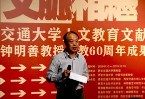 陕西师范大学党委副书记卢胜利发言,作为陕西师范大学56级中文系校友,钟明善教授始终关心母校发展,回校讲学、出力献策;他感怀其与已故文学大家霍松林先生的师生情谊,并盛赞钟教授的杰出成就“彪炳校史,垂范师生”,钟明善教授及其研究成果是两校共同的财富与骄傲。同时,他表示,此次活动正是践行习总书记关于弘扬中华优秀传统文化系列重要指示精神的体现,彰显交大“以文化人、以美育人”的教学传统和西迁精神内核。西安交通大学主动变革、融入社会的帷幕已拉开,祝愿交大在新征程里为西部发展、国际建设注入新的活力。