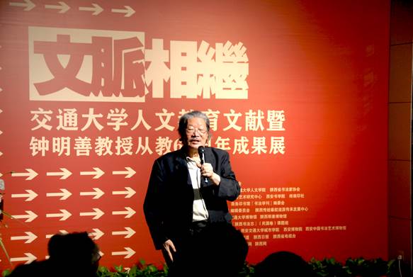 全国政协常委、中国书法家协会主席苏士澍在发言中表达了对钟明善教授的诚挚敬意,他表示,本次展览不仅对交通大学思想文化建设具有重要意义,对历任中国书协学术委员、理事、副主席、顾问,也是中国书协成立见证者的钟明善教授之学术、艺术、教育进行回顾,同样是中国书坛的一件大事。钟先生作为蜚声海内外、德艺双馨的学者、书法家、教育家,在艺术创作、书法研究、书法教育、书法文化海外传播、书法学科建设、书法活动组织等领域对当代书法发展做出突出贡献,他坚守传统文化之精髓和人民立场,以精湛的书艺和深厚的学养为世人称道,培养了大批书法创作人才和理论研究人才,为中国书法艺术的发展与繁荣,为中国书法走向世界做出了重要的贡献。正因有像钟明善教授这样一批在全国具有重要影响力的专家学者,学校学科建设和文化建设影响力得以彰显,“双一流”建设的动力十足。