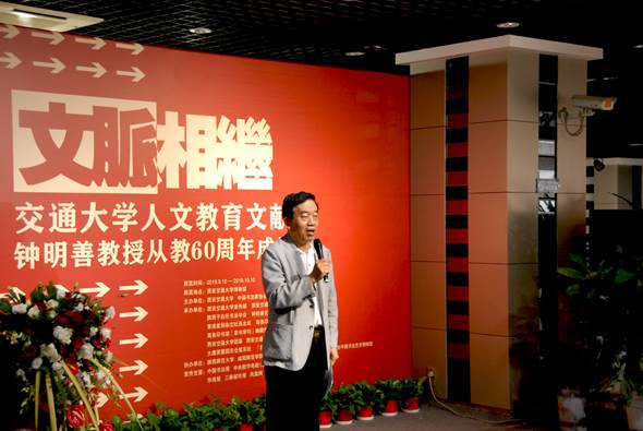 2019年9月10日,适逢新中国七十华诞与第三十五个教师节,彩带当空,幕墙殷红,几个主题大字格外引人注目,“文脉相继——交通大学人文教育文献暨钟明善教授从教60周年成果展”在西安交通大学博物馆顺利举办。该展览展示内容为包括了叶恭绰、陆定一、茅以升书法真迹及唐文治、张元济、侯宗濂、彭康等墨迹复制品在内的交通大学历史上名家书法及人文艺术教育文献、钟明善教授各时期书画代表作六十幅、钟明善教授教学成果及书法专业教育成果等四大板块,充分展现交通大学人文教育之根脉绵长。