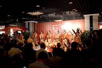 上午10时,由大唐芙蓉园东仓鼓乐社带来世界非物质文化遗产西安鼓乐表演,乐器精良,阵容庞大,演绎出盛唐时期的恢弘乐音。在西安交通大学副校长席光的主持下,展览拉开序幕。