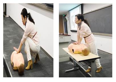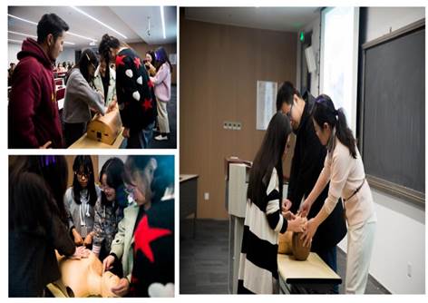 现场演示环节。为了使同学们更直观形象地学习心肺复苏技术要领,周主任带来了医用模拟假人,边讲解边操作。在按压环节,她强调了务必找准按压位置,注意按压频率与力度,边按压边观察等。在人工呼吸环节,她演示了如何打开气道、进行人工呼吸。