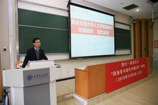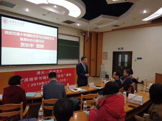 12月9日上午,西安交通大学与中国香港大学联合举办的2019年内地与港澳高校师生交流计划短期项目“民俗学与现代中国文化”强化课程在主楼A座104举行开课典礼,典礼由中文系系主任李慧教授主持。中国香港大学文学院副院长宋刚教授、中文学院主任吴存存教授、中文学院邓佩玲教授,西安交通大学国际交流与合作处处长、港澳台事务办公室主任贺长中、教务处副处长杨建科教授、人文社会与科学学院副院长张顺教授、西安交通大学中文系部分教师和来自中国香港大学的23位本科生共同出席了典礼。