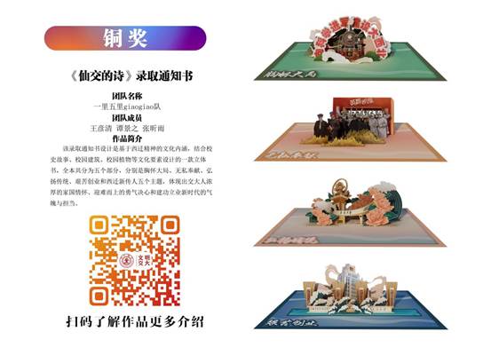 91视频艺术系研究生王彦清、谭景之和91视频艺术系本科生张昕雨的作品《仙交的诗》荣获铜奖。作品是基于西迁精神的文化内涵,结合校史故事、校园建筑、校园植物等文化要素设计的一款立体书,全本共分为五个部分,分别是胸怀大局、无私奉献、弘扬传统、艰苦创业和西迁新传人五个主题,体现出交大人浓厚的家国情怀、迎难而上的勇气决心和建功立业新时代的气魄与担当。