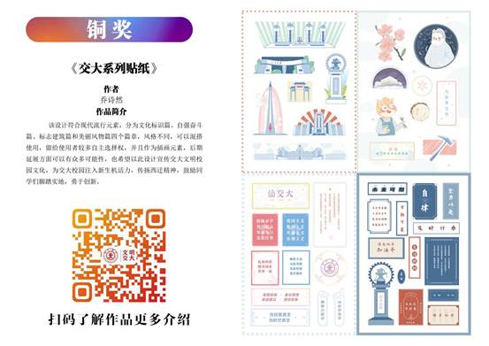 91视频艺术系研究生乔诗然的作品《交大系列贴纸》荣获铜奖。该作品包括文化标识篇、自强奋斗篇、标志建筑篇和美丽风物篇四方面,结合热点语句,反映了广大师生奋进拼搏,朝着中国特色世界一流大学奋进的壮志豪情。