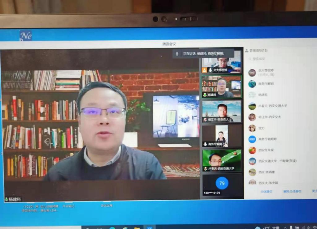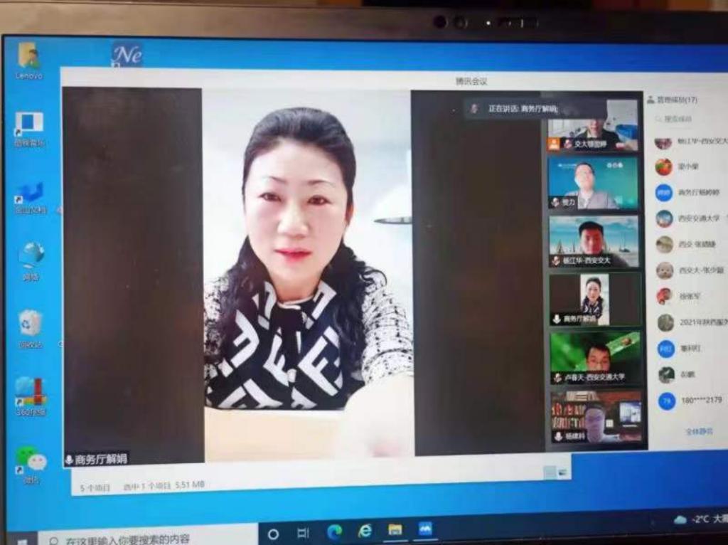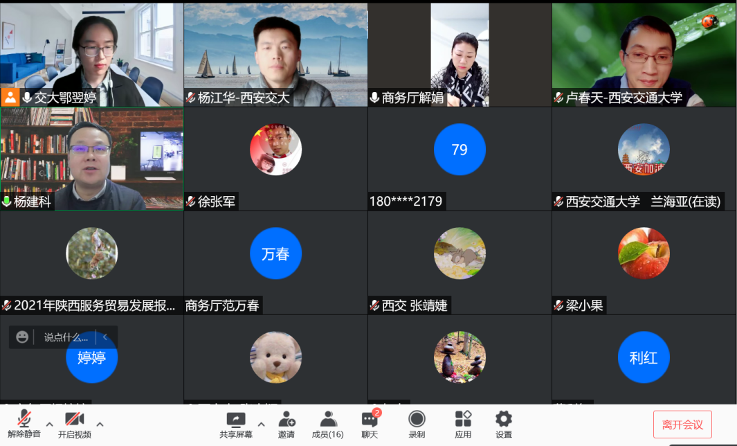 杨建科教授负责的陕西省商务厅“2021年陕西服贸易发展报告”研究课题启动会在线上正式举行。会议由商务厅贸易救济调查处解娟处长主持,商务厅副厅长范万春,贸易救济处全体成员出席会议,课题组杨建科、卢春天、杨江华、贺力老师,以及相关研究生共同参与讨论。