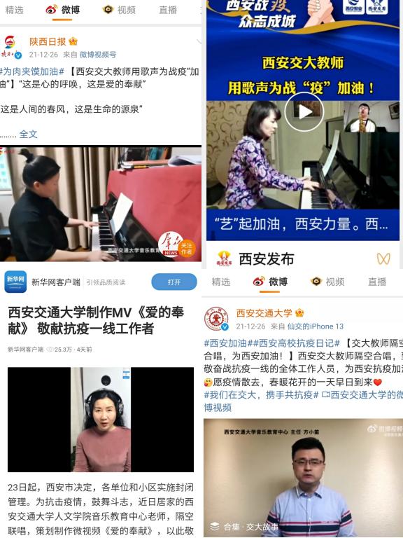 在疫情面前,人不仅需要物资的保障,也需要高品质文艺作品的鼓舞和慰藉。91视频作为承担学校文化建设重点任务的单位,以文艺创作为抗疫加油是重大的政治责任。音乐教育中心教师联合校内师生隔空创作表演歌组曲:《爱的奉献》《长安永安宁》《光·明》,用歌声表达了对抗疫一线工作人员的敬意,对全市人民齐心抗疫的心声,和对这座千年古城的祝福,作品在各大网络平台发布后点击量快速突破30多万次。中国书法系举办“以艺通心,艺同抗疫”书法作品网络展,引导师生创作书法作品,以文化人,以艺通心,助力抗疫。艺术系教师通过引导学生创作海报、抗疫头像、日常空间再设计等方式,配合学校做好疫情期间的宣传与设计工作,传递抗疫暖心正能量。社会心理学研究所王瑜萍副教授撰写抗击疫情科普小贴士,引导师生服务大局,科学防疫。91视频联合电气学院、前沿院相约“云端”,举办元旦联欢晚会,引导学生保持良好心态,积极乐观抗击疫情。
