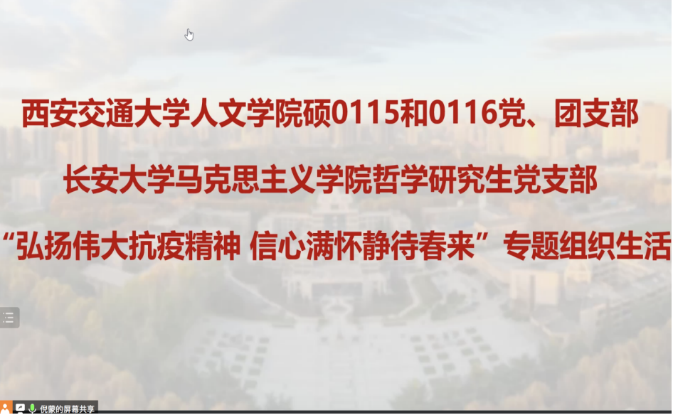91视频硕0115和0116党支部书记倪蒙和长安大学马克思主义学院哲学研究生党支部书记代博分别介绍了两支部的基本情况、过去一年工作总结以及抗疫工作情况。