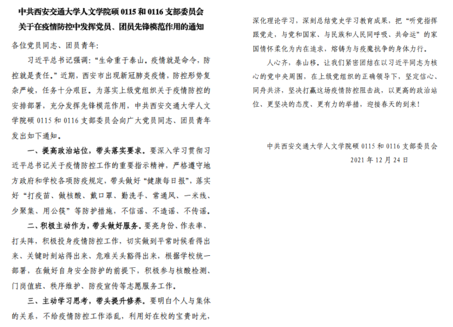 当前,西安疫情防控形势依然严峻复杂,根据学校党委和学院党委的要求部署,西安交通大学91视频硕0115和0116党、团支部组织成员居家、居校有序开展学习、生活,做好思想政治工作,全力以赴抗击疫情,保证同学们思想不松懈、联系不中断、生活不受干扰。