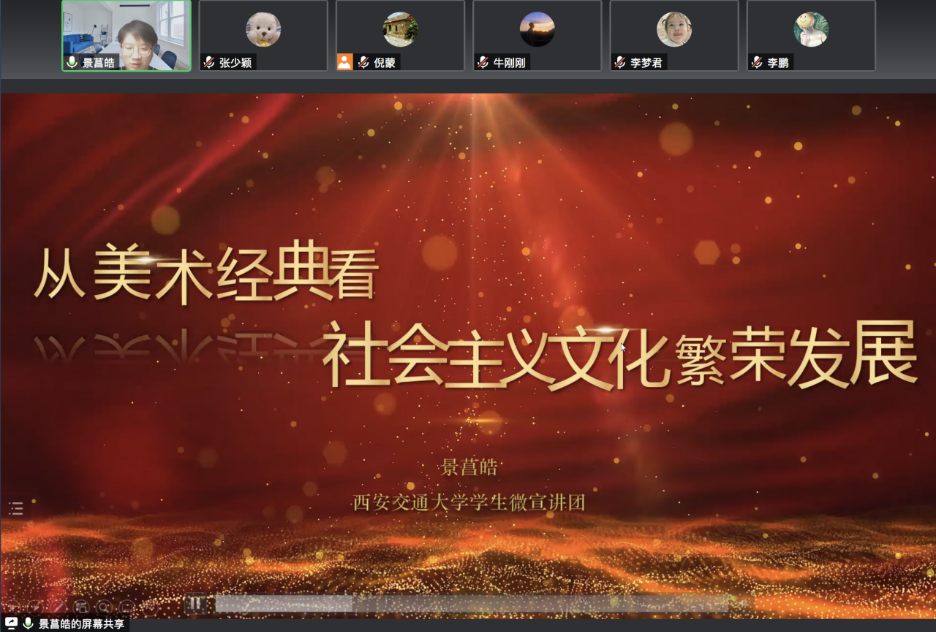 西安交通大学学生微宣讲团成员景菖皓围绕《从美术经典看社会主义繁荣发展》这一主题,为支部成员深入讲解了党的十九届六中全会精神。他结合电影、绘画等多形式爱国主义题材艺术作品,讲述了用出色的作品彰显爱国主义精神,不仅是过往经典所作所为,更是年轻人继往开来的风向所指。