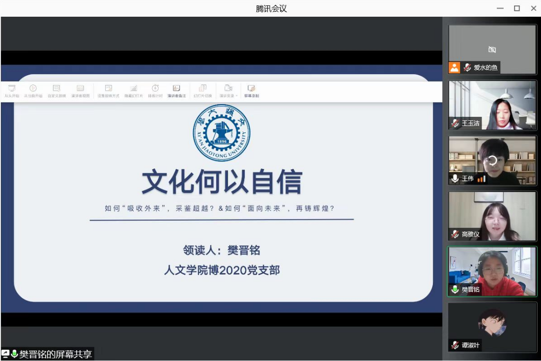 读书会由高雅仪、王玉洁和樊晋铭三位同学共同领读沈壮海等著的《文化何以自信》。高雅仪从第一二章的文化自信何以“最根本”及文化自信的底气从何而生进行论述分享。文化自信是中国特色社会主义道路自信、理论自信、制度自信的深层底蕴,同时,文化自信是中国特色社会主义道路自信、理论自信、制度自信的鲜活表达。中国优秀传统文化的深厚积淀、中国特色社会主义文化的繁荣兴盛、当代中国发展的耀世成就和不断增强的文化自觉都给了我们文化自信的十足底气。