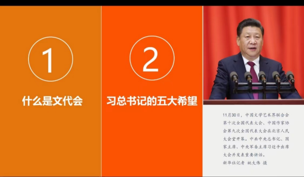 蒋悦以“与党同心同德、与人民同向同行”为核心,带领大家学习了习近平总书记在中国文联十一大、中国作协十大开幕式上的重要讲话。她首先对文代会和作代会进行介绍,清晰地阐述了中国文联和中国作协两者之间的关系,随后又分享了习总书记提出的五大希望。