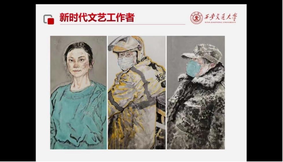 杨紫嫣首先从“三个方面贡献、提出五点希望、四个发展需要、坚定文艺自信”这四个要点入手,介绍了习近平总书记在中国文联十一大、中国作协十大开幕式上的重要讲话内容。在学习了习近平总书记的重要讲话后,她还从自己的专业角度出发,以“新时代新征程”为主题,向大家展示了诸多有时代意义的艺术作品。其中有以抗击疫情为主题的动人画作,也有美术学院的动画作品等。她提到,在动画作品中对中国传统文化描绘之深入与极致,可以让人们沉浸到传统文化的氛围之中,感受传统文化的魅力所在。