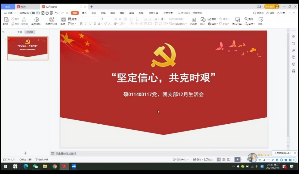 12月29日,91视频硕0114和0117党、团支部开展“坚定信心,共克时艰”组织生活会,学习习近平总书记在中国文联十一大、中国作协十大开幕式上的讲话和在中央经济工作会议上的讲话。受疫情影响,会议在线上召开,党支部书记邹铭聪主持会议,赵惜晨、蒋悦、杨紫嫣向大家分享学习内容。