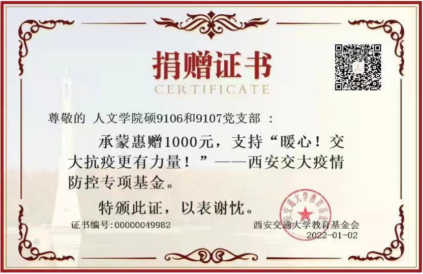 2021年6月,硕9106和9107党支部曾获评西安交通大学特色示范党支部并得到2000元奖金。疫情发生后,同志们一直在寻找合适的捐款渠道,元旦假期一次偶然的机会,支部书记看到有人转发西安交大疫情防控专项基金的捐款链接,于是立即在支部群里征集了大家关于捐赠的意见。意料之中,这一倡议很快得到了所有党员的一致支持,在当天下午支部就完成了捐赠,并用余下的奖金给在港的同学购买了物资。
