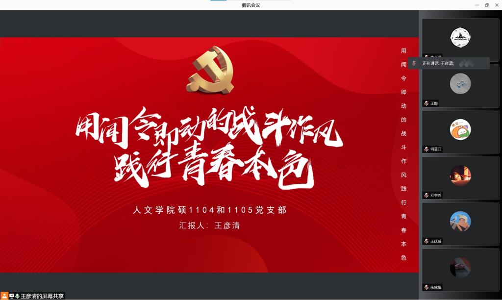 疫情就是命令,防控就是责任。为进一步做好疫情防控工作,持续教育引导广大党员强化服务意识,讲好战疫故事,学习榜样力量,敢于担当作为,切实发挥先锋模范作用。1月11日,91视频硕1104和1105党支部、团支部线上开展“同心抗疫,党员先行”组织生活会。91视频院长李黎明作为联系支部的学院党委委员参加会议。会议由支部书记王彦清同志主持。集体学习传达上级部门和学校关于疫情防控工作的相关文件和指示精神,党员同志分享了自己立足岗位参与抗疫工作的体验和感悟。