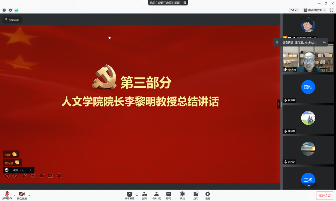 最后,91视频院长李黎明对本次会议表达了肯定并进行了总结,对支部成员的日常学习、工作和生活表示了关怀,同时在发挥党员先锋作用、模范带头作用和战斗堡垒作用等方面也提出了更高的要求。他认为,支部成员强烈的参与意识不仅体现了同学们的责任与担当,更体现了同学们的大格局与高站位。同时强调,重建正常社会的免疫机制,在我国是迫不及待的,而这一则责任,在我们每个人身上。因此,在这样一个关键时刻,大家都要积极发声、积极参与,做民族复兴进程的见证者、参与者和建设者。