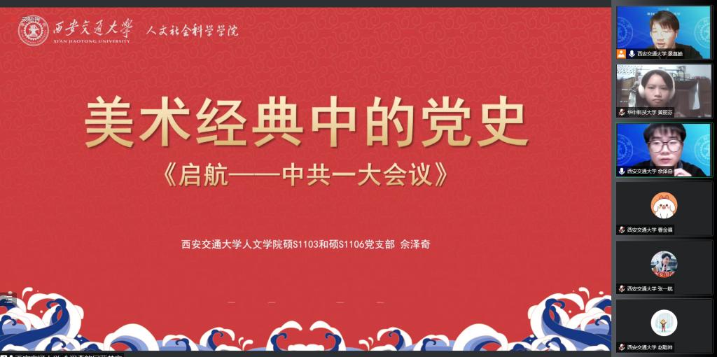 西安交通大学艺术设计专业硕士生佘泽奇同学进行微党课美术经典中的党史《启航——中共一大会议》的讲解,以这幅油画别具匠心的艺术创作谈及中共一大的历史背景、中共一大召开的时间考证与地点转移,最后他讲到红船精神“1921年,中国共产党诞生。这一伟大历程,是中国共产党和中国人民用鲜血、汗水、泪水写就的,充满着苦难和辉煌、曲折和胜利、付出和收获。”