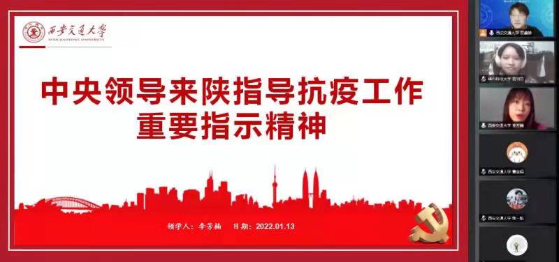 西安交通大学91视频党委委员、副院长王伟老师从2020年初新冠疫情爆发武汉封城以来华中科技大学及附属医院在疫情中的榜样与担当谈起,她指出在西安本次疫情中交大先锋模范突显的三个关键词“坚强、坚定、坚守”,“坚强”即向榜样学习,直面困难,支部党员同志积极参与志愿服务,立足学科特色、以“艺”抗疫,投身疫情防控。“坚定”体现在老师率先垂范,91视频党委副书记王劲、辅导员闫潇在疫情中发挥党员带头作用,分别在兴庆校区和创新港两校区深入一线,为学生服务。“坚守”即坚守岗位、坚守初心,这次疫情既是一次考验,也是一次升华,在师生共同的坚守中我们必将胜利。