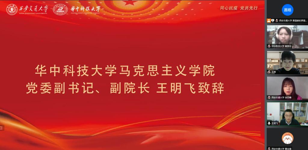 华中科技大学马克思主义学院党委副书记、副院长王明飞老师讲到“西安、武汉两个城市共同经历了抗疫,有共同的情感”,他回顾去年武汉的抗疫,感谢陕西援鄂医疗队的1460名医务工作者为武汉疫情76天清零做出的贡献,并表明了对西安疫情防控的信心。他说“西安交大的西迁精神为我们所敬佩”,最后对两校的历史渊源和交往事迹进行回顾,并祝愿两校今后能有更紧密的合作与往来。