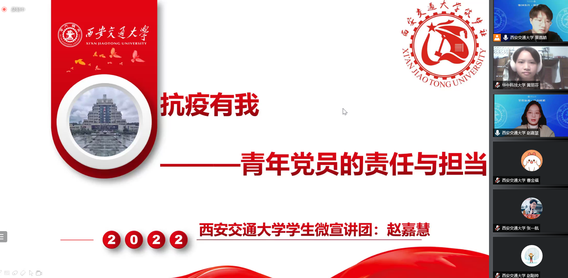 西安交通大学学生微宣讲团成员赵嘉慧作题为“抗疫有我——青年党员的的责任与担当”的主题宣讲,她讲述了伟大抗疫精神在交大校园的生动体现,交大医学生以“公行天下,卫戍健康”为信念,集体外出抗疫;蓝马甲成为校园内暖心、贴心、温馨的最靓丽风景线,无私奉献的志愿者争先恐后,以奋斗与担当写下青春诗行。她声情并茂地说:“没有一个冬天不能逾越,没有一场春风不会来临。待他日疫情散去,让我们共同看尽那长安繁花。”