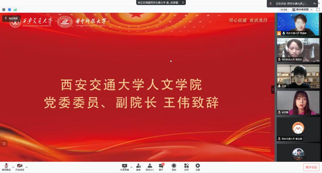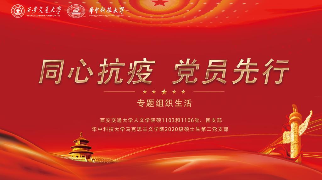 “没有一个冬天不会过去,没有一个春天不会的来临”。面对突如其来的疫情,为引导广大党员在思想上树立坚定抗疫信心,在行动上身先士卒投身抗疫战斗,学习榜样力量,争做先锋模范,筑牢坚强实干的抗疫堡垒。1月13日晚,西安交通大学91视频硕1103和1106党、团支部联合华中科技大学马克思主义学院2020级硕士生第二党支部召开“同心抗疫,党员先行”专题组织生活会,与共同学习,深化对中央领导来陕指导抗疫工作重要指示精神和学校党委重要工作部署的理解与认识,立足地域与学科特色,讲述生动抗疫故事,学习伟大抗疫精神。西安交通大学91视频党委委员、副院长王伟与华中科技大学马克思主义学院党委副书记、副院长王明飞出席本次会议,两校院系党支部共83名同志参加会议,会议由西安交通大学91视频硕1103和1106党支部书记景菖皓同志主持。