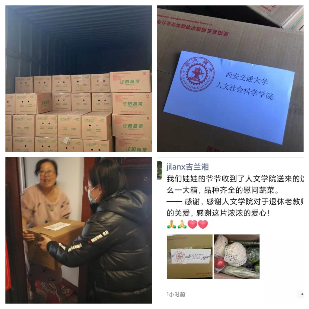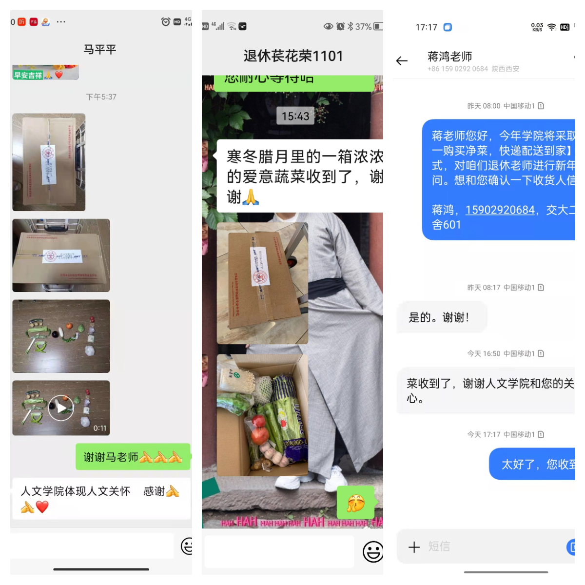 疫情期间,蔬菜供应困难也成为老同志们反映的共性问题,在了解到西迁老教授卢烈英老师买菜困难后,许佳辉书记先后两次自费购买蔬菜送至卢烈英老师家中。为解决老同志们的具体生活需要,学院又召开会议专题研究,决定采用统一购买净菜,快递到户的形式,给离退休老同志送去新春的慰问和关怀,对身体不便领取困难的老师,学院还会安排专人负责发放到家。收到学院快递来的新鲜蔬菜,老同志们脸上洋溢着幸福的笑容,他们对学院给予的关心和照顾表示由衷地感谢。“前天刚采集完收货人的信息,今天就收到了一箱精品菜,感谢学院一直以来的关心关怀。”“寒冬腊月里一箱带着浓浓爱意的蔬菜已经收到,谢谢。”退休教师马西平将收到的蔬菜摆放成“爱心”的字样,表达对学院人文关怀的感谢。年关将近,一箱新鲜且种类丰富的蔬菜,为老同志们带来了冬日贮藏的安心和熟悉的年味儿。