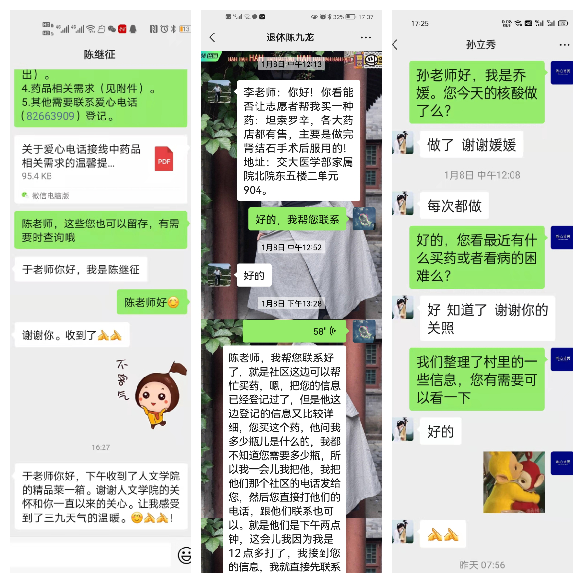 疫情期间,老同志们的信息接收不畅,学院及时整理了家属区抗疫爱心电话,做老同志们的“贴心人”。退休教师陈九龙刚做完肾结石手术,在家中休养,无法购买术后所需的药品坦索罗辛。专班成员李倩在日常慰问中得知这一消息后,立刻联系了交大医学部家属院的志愿者,反映了陈老师的急迫需求,并详细提供陈老师的基本信息和病症情况。“李倩,谢谢你,社区志愿者已经和我沟通过,可以帮我购买药品。之后我还有需要就直接联系他们。”信息的接力、爱心的传递,都是为了给老同志们提供更好的生活服务保障。