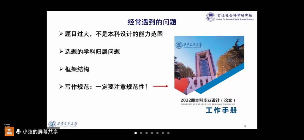 社会学系副主任郭小弦副教授对于毕业论文的时间流程进行了详细的介绍,为同学回答了如何解决经常遇到的问题,比如选题的学科归属问题,题目过大等问题。重点强调了写作的规范性和答辩要求。