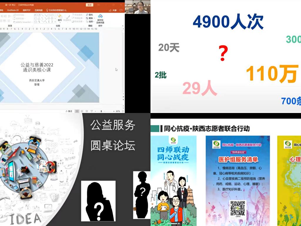 社会工作彭瑾副教授所在的《公益与慈善》课程团队有两位教师在这次疫情中以社会工作者的身份参加了陕西省志愿服务项目,助教也作为志愿者参加了学校的志愿服务,他们将此作为课程思政的鲜活素材,在2022年春季学期课程的“线上第一课”跟同学们交流和分享。她说:“这次疫情其实就是一次‘大思政’‘大课堂’,我们要用好这个课堂。”