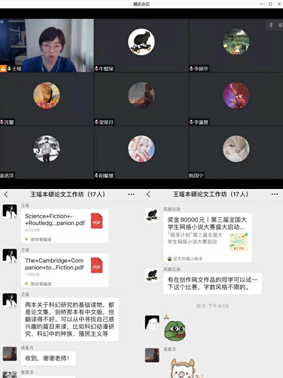 中文系系主任、副教授王瑶以线上会议的形式举办了硕士论文工作坊。她的四位硕士生分别就自己硕士毕业论文的阶段性研究成果、本学期的总结与收获、感兴趣的研究方向进行了汇报。在抗击疫情这一特殊且艰难的时期,线上论文工作坊不仅为师生提供了学术与生涯规划交流的平台,也有助于师生们通过相聚的形式更密切地交流与相互关心,在心理上舒缓了学生的压力与紧张情绪。