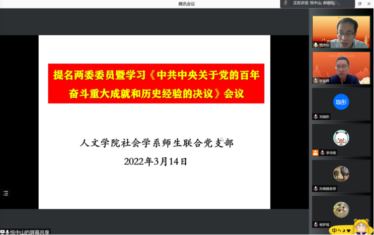 为深入领悟《中共中央关于党的百年奋斗重大成就和历史经验的决议》(简称《决议》),更加坚决捍卫“两个确立”,做到“两个维护”,3月14日,社会学系师生联合党支部举办了《决议》专题学习会。会议由支部书记悦中山主持,全体师生党员参加,91视频党委书记许佳辉莅会指导。