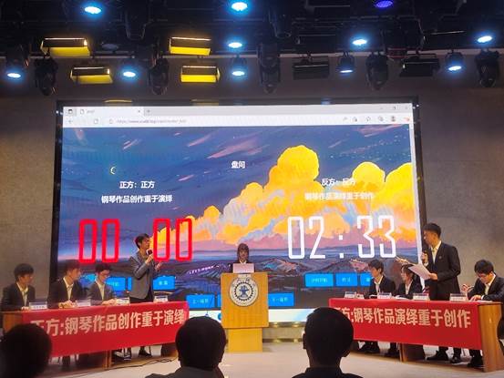 活动开始前,四位同学暖场表演。从悠扬舒缓的《乌苏里船歌》,到意志昂扬的《旱天雷》,从优美抒情的《彩云追月》,再到激越欢快的《山丹丹开花红艳艳》,四首钢琴曲引来了台下热烈的掌声。随后,来自该校各学院各专业的同学就“钢琴作品创作重于演绎,还是演绎重于创作”这一主题展开激烈辩论。