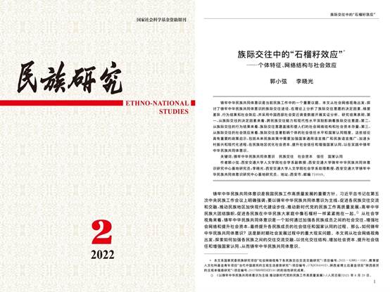近日,西安交通大学社会学系郭小弦副教授和李晓光助理教授合作完成的研究《族际交往中的“石榴籽效应”——个体特征、网络结构与社会效应》于《民族研究》2022年第2期发表。
